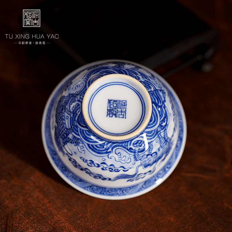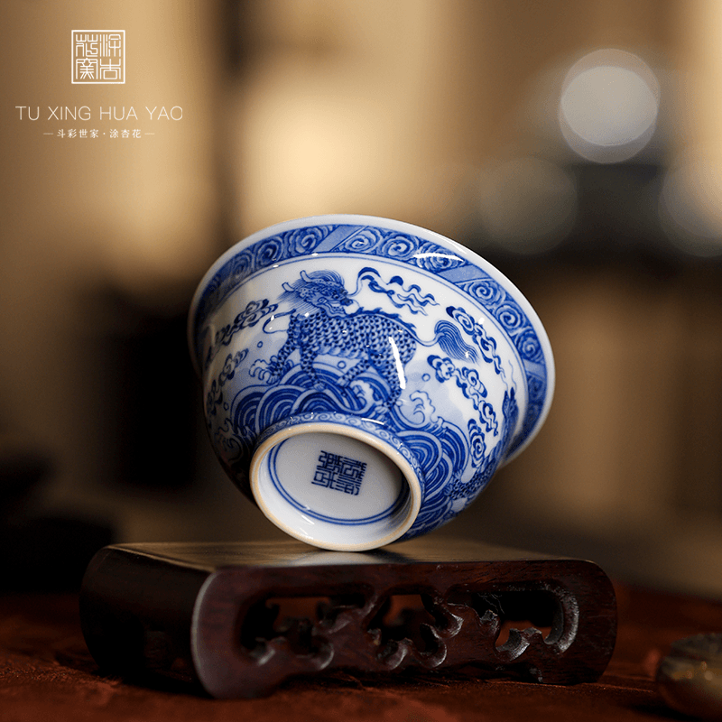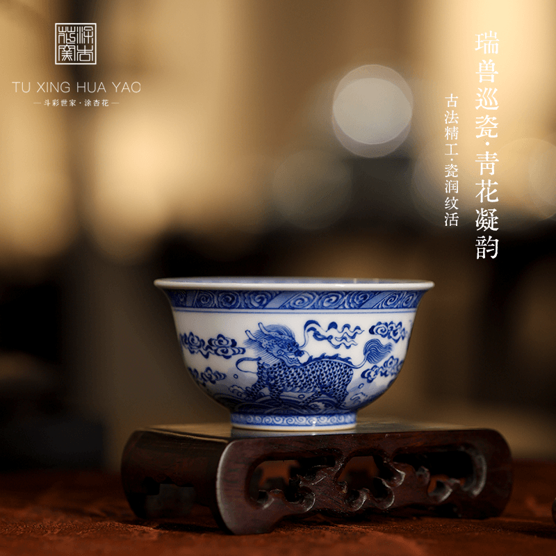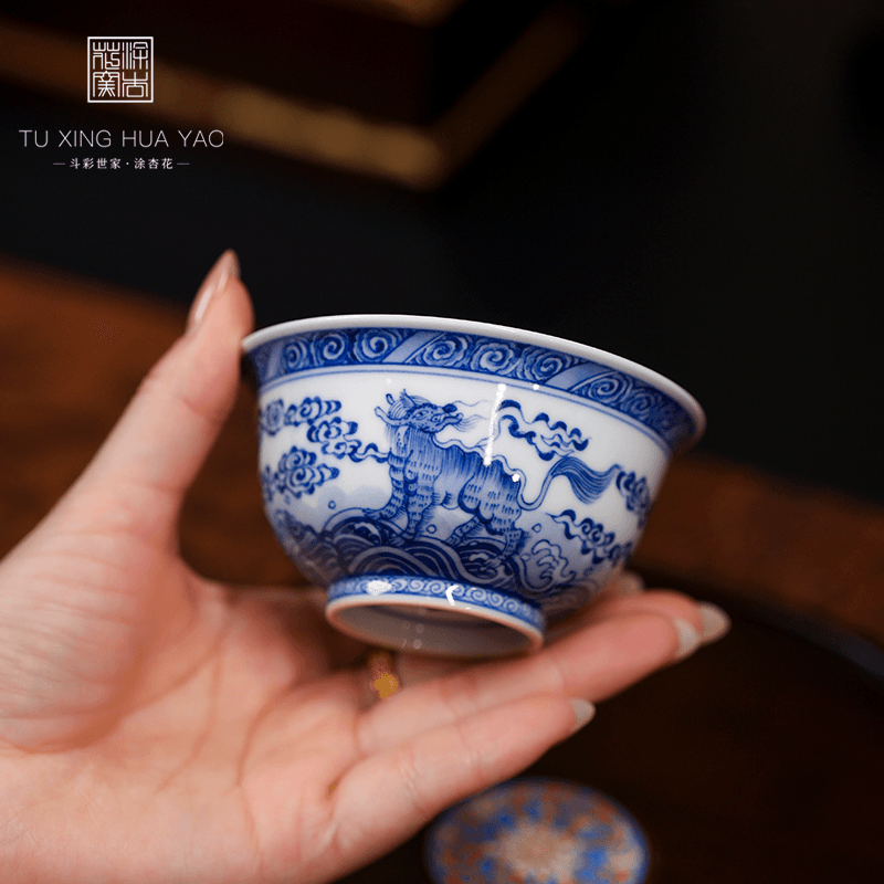 涂杏花斗彩青花瑞兽纹杯手绘 景德镇陶瓷主人杯收藏作品